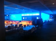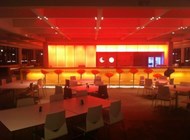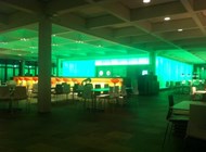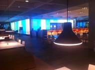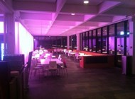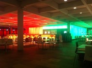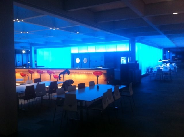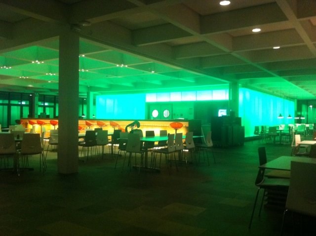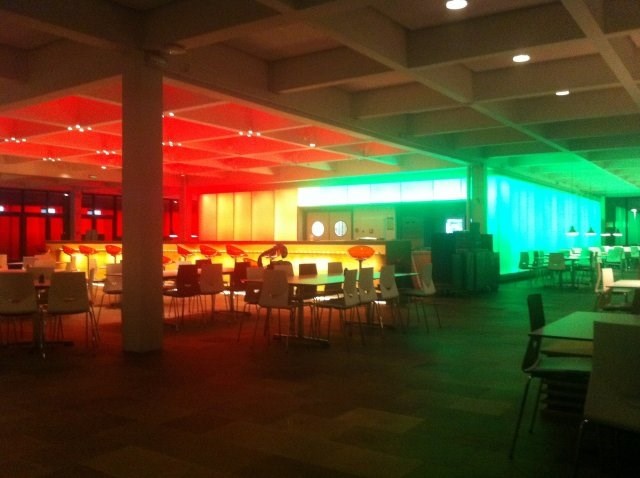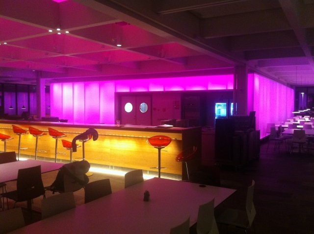 SpektraLED fik, i forbindelse med renovering af bygning 342 på DTU, til opgave at levere en glasvæg med RGB lys. Bygningens KNX styring sender signal til den installerede e:cue styring om tænd/sluk. Alle bygningens pendler, downlights og effektbelysning styres fra e:cue Programmer LAS løsning med en ELO Touchskærm placeret i baren. Se mere information fra DTU HER