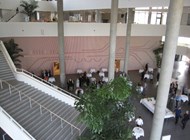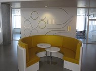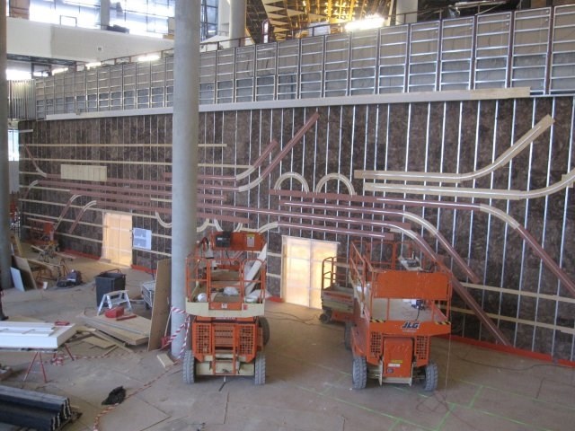 Udsmykningerne arbejder med begrebet tid i flere bygningsintegrerede ure: I facaden, ved auditoriet og ved undervisningslokaler. Indendørs vises timer, 10 minutter og minutter i lysende buer og i korte og lange linier.